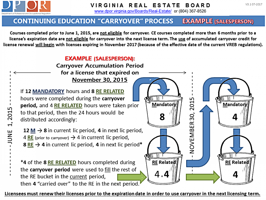 Real Estate Licensees who have completed all of their required Continuing Education (CE) credit hours--16 for a Salesperson and 24 for a Broker--in the previous licensure term, and who have completed extra credit hours in the last six months of that same licensure period, may qualify to "carry over" extra CE credit hours and apply them to their current licensure period.