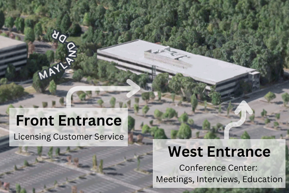 Visitors for licensing customer service should use the first-floor main entrance. If you are attending a Commonwealth Conference Center event on the second floor (e.g., board meeting, informal fact-finding conference, remedial education), use the building's west entrance.